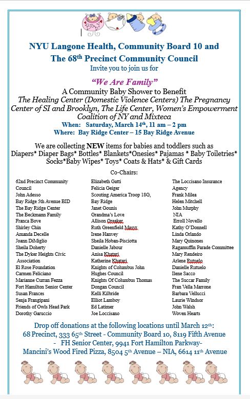 Join NYU Langone and the 68th Precinct in a community baby shower to benefit domestic violence centers. They are collecting NEW items for babies and toddlers including: diapers, diaper bags, bottles, blankets, onesies, pajamas, baby toiletries, socks, baby wipes, toys, coats, hats, and gift cards. Donations can be dropped off on March 14 at the Bay Ridge Senior Center OR prior to March 14 at: the 68th Precinct (333 65th Street, Brooklyn), Brooklyn Community Board 10 office (8119 5th Avenue, Brooklyn), Fort Hamilton Senior Center (9941 Fort Hamilton Parkway, Brooklyn), Mancini’s Wood Fired Pizza restaurant (8504 5th Avenue, Brooklyn), and NIA office (6614 11th Avenue, Brooklyn).